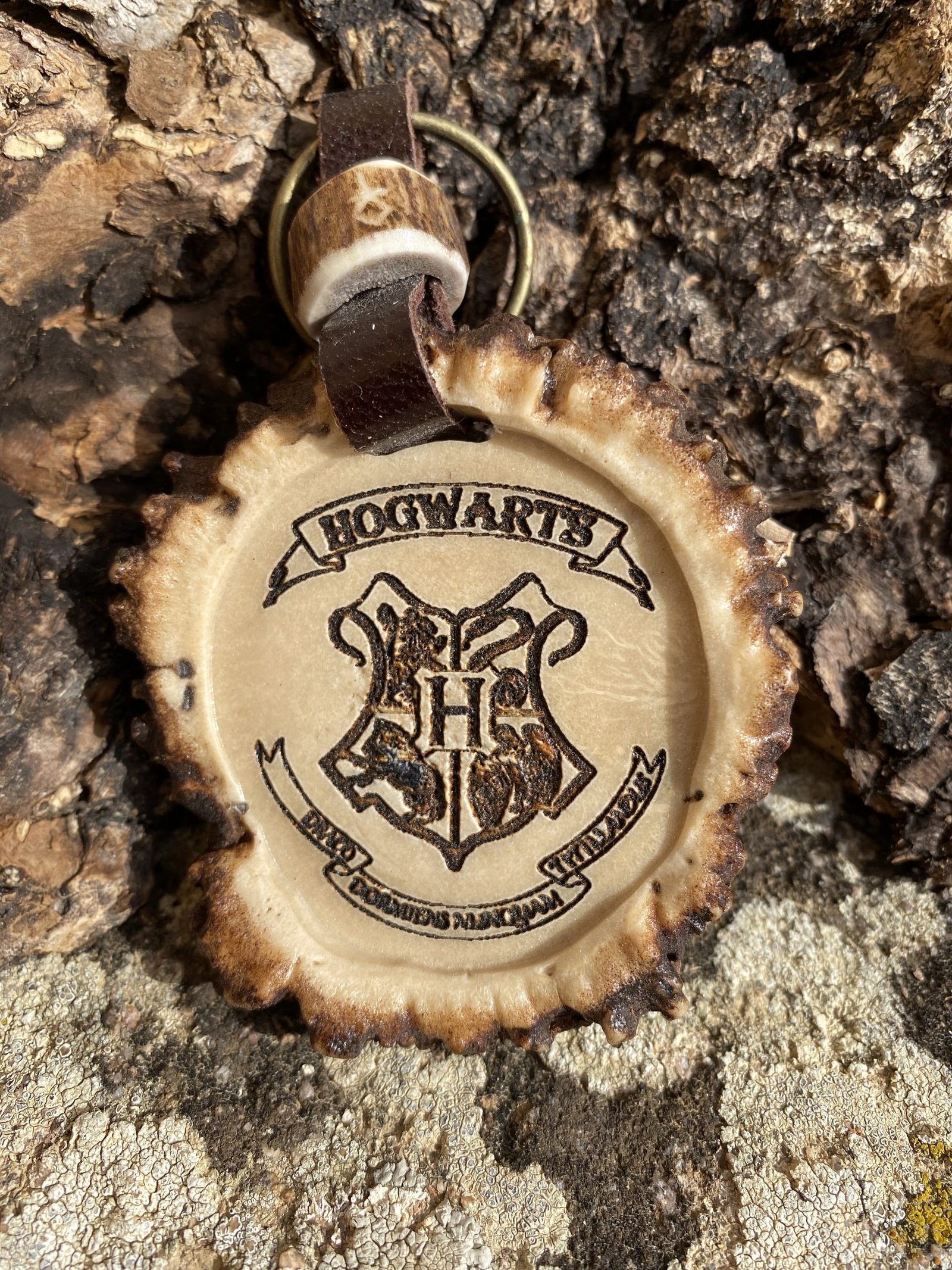 Llavero de roseta de ciervo grabada a laser. Escudo de Harry Potter. Personalizable con nombre o cualquier otro escudo o diseño diferente.