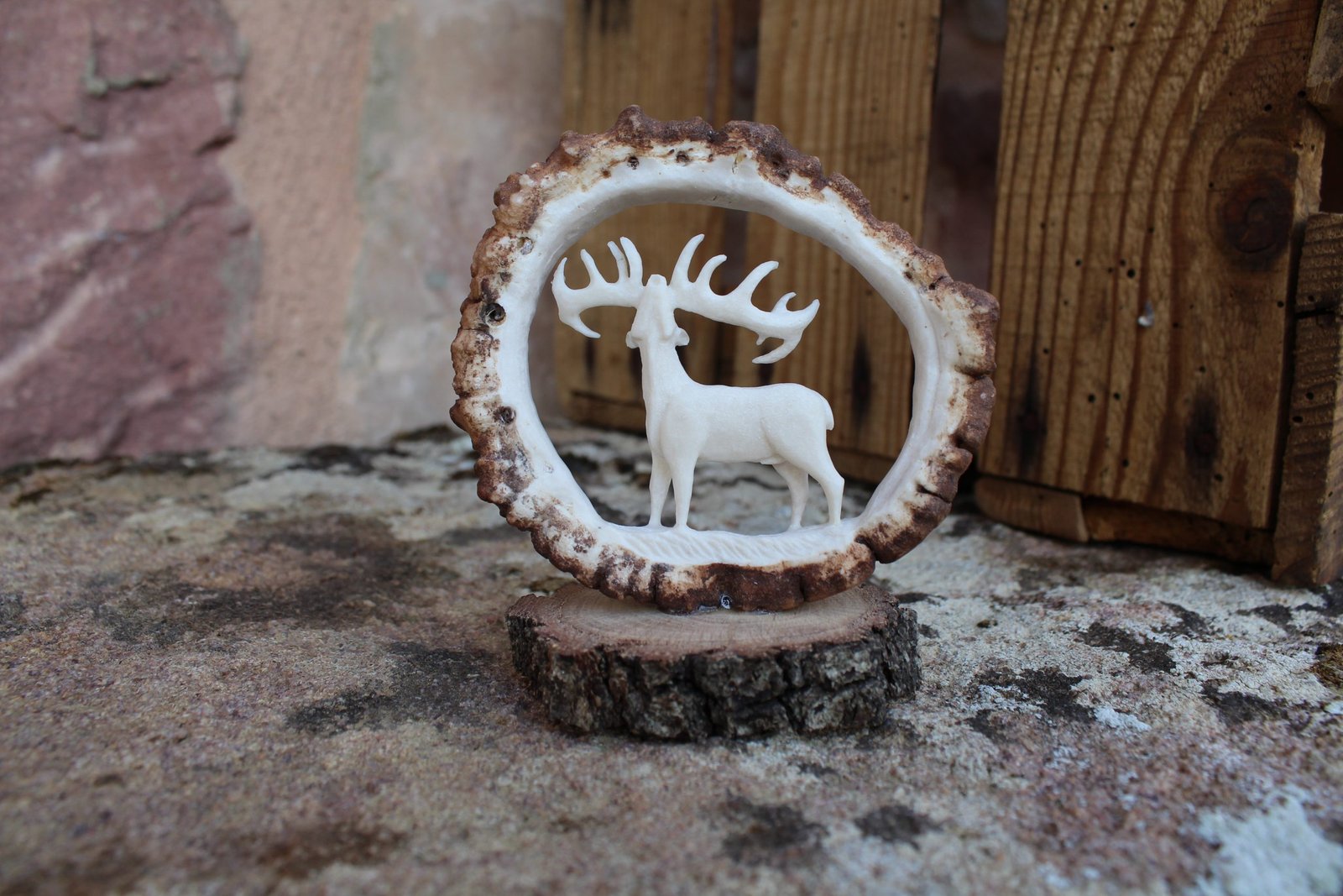 Pieza decorativa con ciervo en escena de berrea tallado.